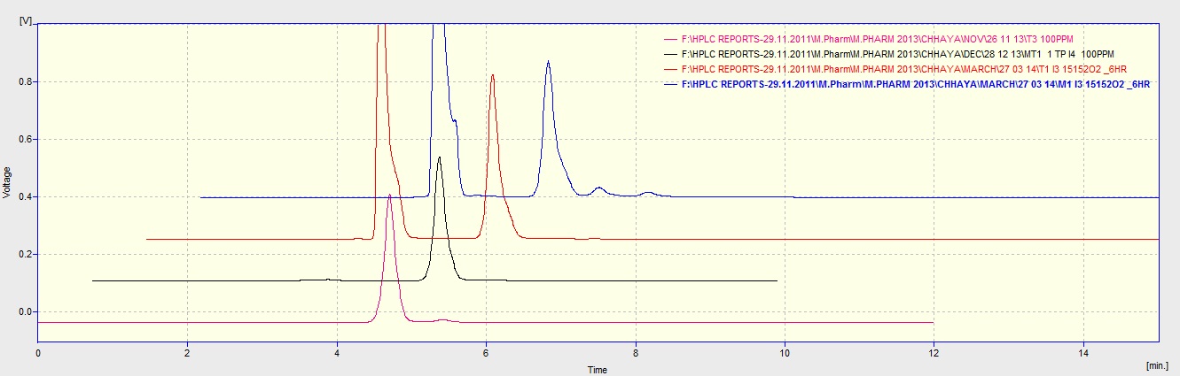 Fig. 5: Overlain Chromatograms of degradation in hydrogen peroxide (30 % H2O2, refluxed at 40ºC for 6 hrs.): Pink – API, Black- Ophthalmic suspension, Red- API treated with H₂O₂ stressor, blue- formulation treated with H₂O₂ stressor (API: 4.6, degradant 5.31 & 6.3)