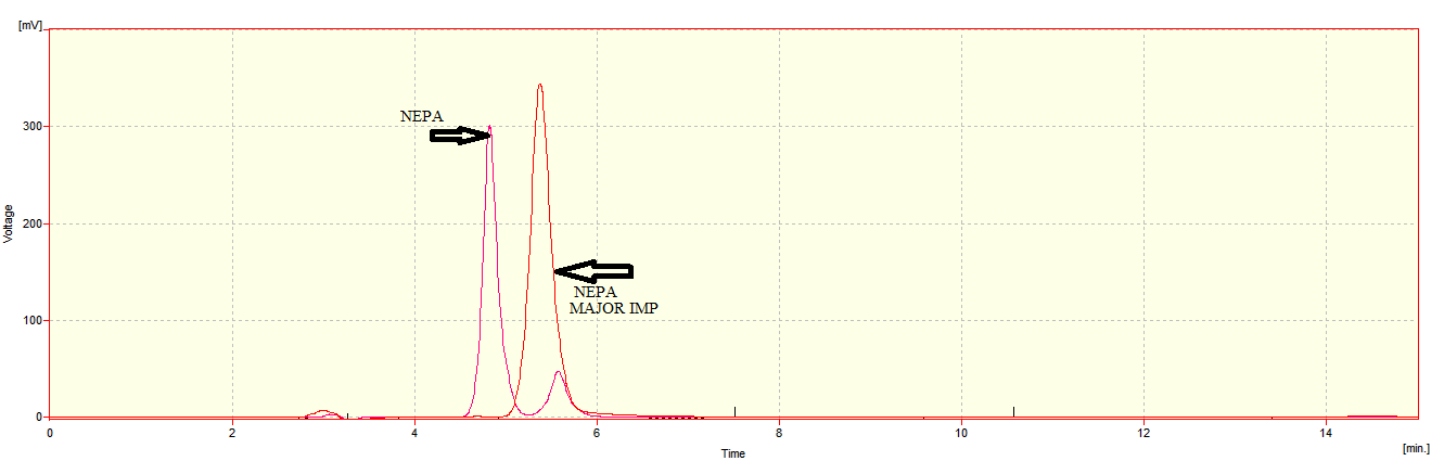 There is always need for significant SIM’S in modern analytical labs. Environmental factors, such as the temperature, pH,buffer species, ionic strength, light, oxygen, moisture, additives and excipients, can play an important role in the stability of drug substances. Stress testing can help in identifying degradationproducts and provide important information about the intrinsic stability of drug substances [3]. Stability indicating assay is defined as a validated quantitativeanalytical procedure that can detect the changes with time in the pertinent properties (e. g., active ingredient, preservative level) of the drug substance and drug product. A stability-indicating assayaccuratelymeasures the active ingredients without interferencesfrom degradation products, process impurities, excipients, or other potential impurities [4]. No official USP (United States Pharmacopeia Convention) andEP (European Pharmacopoeia) monographs currently exist for NEPA. The literature survey reveals that. Two simple and sensitive visible spectrophotometric methods have been developed for the estimation of NEPA in pure and pharmaceutical dosage forms [5,6]. Determination of NEPA in plasma by RP-HPLC has also been reported [7]. Method for determining chemical purity of NEPA by High performance liquid chromatography with ultraviolet visible detector(HPLC-UV)was disclosed in patent document [8]. The method utilizes gradient elution using mobile phase Ammonium formate buffer (PH 4.25 with formic acid) and acetonitrile (ACN). The separation was carried out on C-18 column. The chromatographic run time was at least 65 min. HPLC-UV studies of the chemical purity or assay of the NEPA was also reported by ElzbietaLipiec-Abramska et al.[9]As in patent document, the method also utilizes gradient elution with mobile phase ammonium formate (pH 4.10 ± 0.02 adjusted with formic acid) and ACN using C18 column at a column temperature of 300C. But the chromatographic run time is 29 min. Hence, the main objective of our work was to develop a simple, accurate and precise, stability-indicating HPLC-UV method for determination of NEPA and its degradation products within a short run time. In contrast to the above reported HPLC-UV methods, the chromatographic run time of the present method is 12 min with isocratic elution. Stress degradation was also performed to determine the most potential degradation related impurities. The validated method was applied to study the rate of degradation of NEPA under acid, base hydrolysis and oxidative degradation.