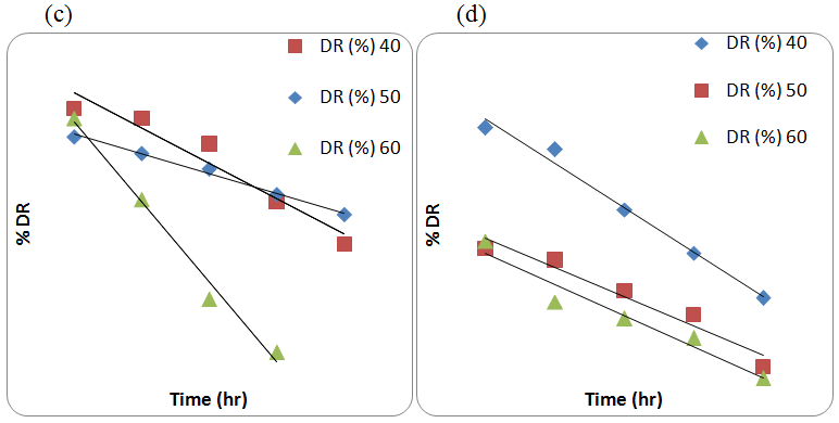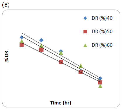 Fig. 12: (a) Zero order Kinetics Plot of NEPA in 0.01, 0.03 & 0.05 N HCl, (b) First order Kinetic plot of NEPA in 0.5, 1.0 & 2.0 N NaOH (c): Zero order Kinetic plot of NEPA in 30% H2O2 (d): Zero order Kinetic plot of NEPA in 15% H2O2 (e): Zero order Kinetic plot of NEPA in 6% H2O2.