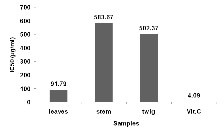 Fig. 1: IC50 values (µg/ml) of the methanol extracts of leaves, stem and twigs of Capparis cartilaginea and vitamin C (vit. C)