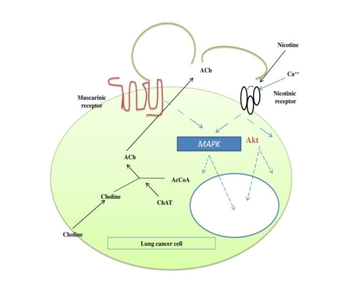 Fig. 1: Model of cholinergic signaling in SCC. Exogenous nicotine activates MAPK and an Akt proliferative pathway through nicotinic cholinergic receptors. Endogenous ACh similarly activates both MAPK and Akt pathways through both muscarinic and nicotinic receptors. Thus, muscarinic antagonists have potential to block proliferation induced both by exogenous nicotine and endogenous Ach as well as antagonizing the up-regulation in cholinergic signaling induced by nicotine (Pingfang et al. 2008).