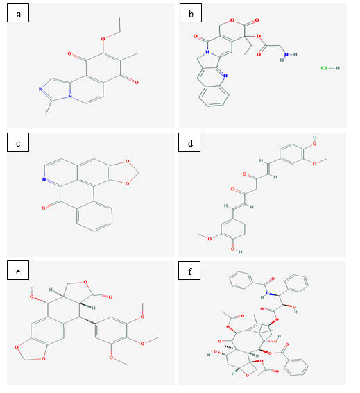 Plant derivatives and analogs were selected for the present study. Ligands selected for In silico docking studies are combretastatins, liriodenine, campothecin, podophyllotoxin, curcumin and Taxol. The sources used for data base collection include Drugbank, PubChem and RCSB protein data bank (PDB). The chemical structures from the collected data sources are drawn using chemskecth software (10.1) Fig. 2 (2a, 2b, 2c, 2d, 2e and 2f) and Auto Dock 4.2.5 is used for effective protein-ligand docking.