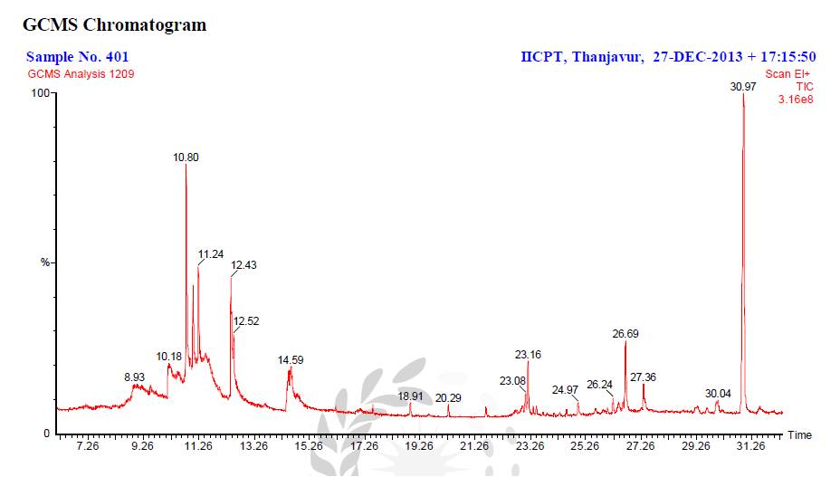 The GC/MS analysis of the methanolic extract of A. bourdillonii was conducted in a Perkin Elmer GC Clarus 500 system, which was interfaced with a Mass Spectrometer. The GC/MS instrument had a Elite-1 fused silica capillary column with a dimension of 30 × 0.25 mm ×0.25 µm df, composed of 5% Dipheny 95% Dimethyl poly siloxane, operated in electron impact mode at 70 eV. The carrier gas used was helium, which had a constant flow rate of 1 ml/min and with an injection volume of 2 µl was employed (split ratio of 10:1). The injector was operated at 250°C and the oven temperature was programmed as follows: 110°C for 2 min, gradually increased to 200°C at 10°C/min, then to 280°C at 5°C/min which was maintained as a isothermal temperature for 9 min. The Mass spectrum of the A. bourdillonii extract was recorded at 70 eV, with a scan interval of 0.5 seconds and a fragment from 45 to 450 Da. Total GC running time was 36 min. The relative percentage amount of each compound present in the GC-MS spectrum was calculated by comparing the individual compounds average peak area to their total areas. Turbo mass 5.2 software was used to handle mass spectra and chromatograms.
