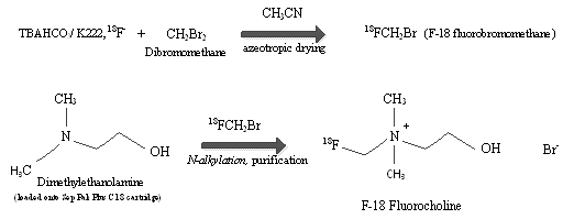 In 2001, DeGrado had successfully synthesised F-18 Fluorocholine using the reactive intermediate, F-18 fluorobromomethane (F-18 CH2Br) [11-13]. DeGrado’s work was followed by Iwata in 2002 but using F-18 fluoromethyl triflate, a different reactive intermediate [14]. In 2008, Kryza and co-workers had successfully synthesised F-18 Fluorocholine using a similar approach as DeGrado but eliminated the use of semi-preparative HPLC column for purification [15].