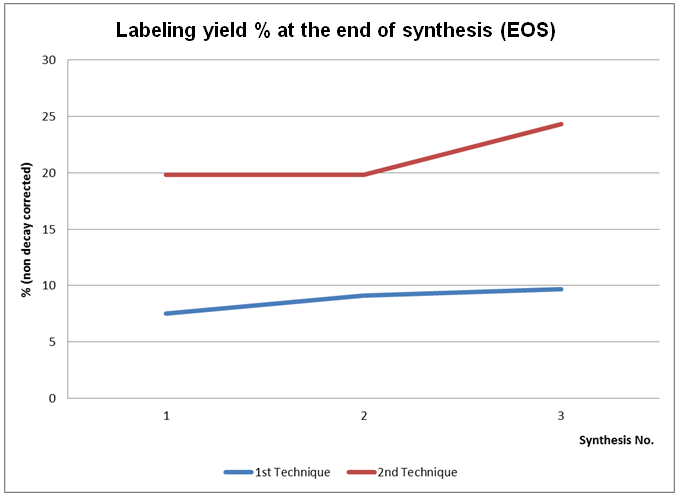 For Technique 1, the highest labeling yield was only 9.7% (decay not corrected) and was found to be lower than the average labeling yield for Group 2, 21.3%.