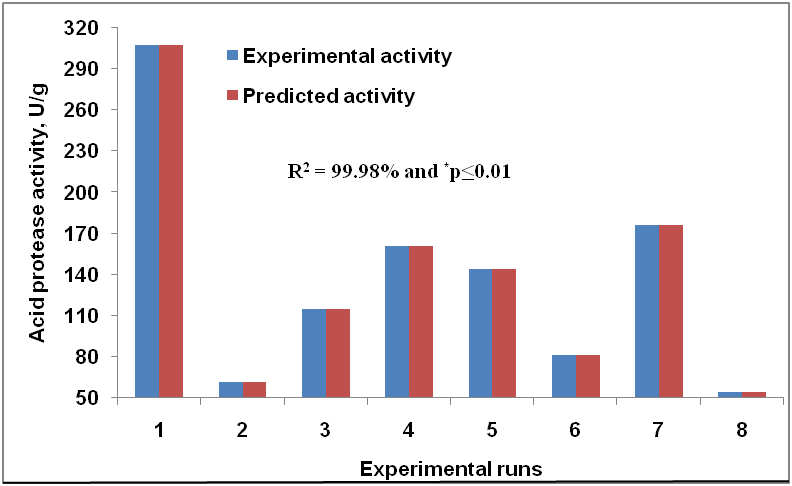 Fig. 1: Depiction of experimental and predicted acid protease activity using plackett-burman design of experiments