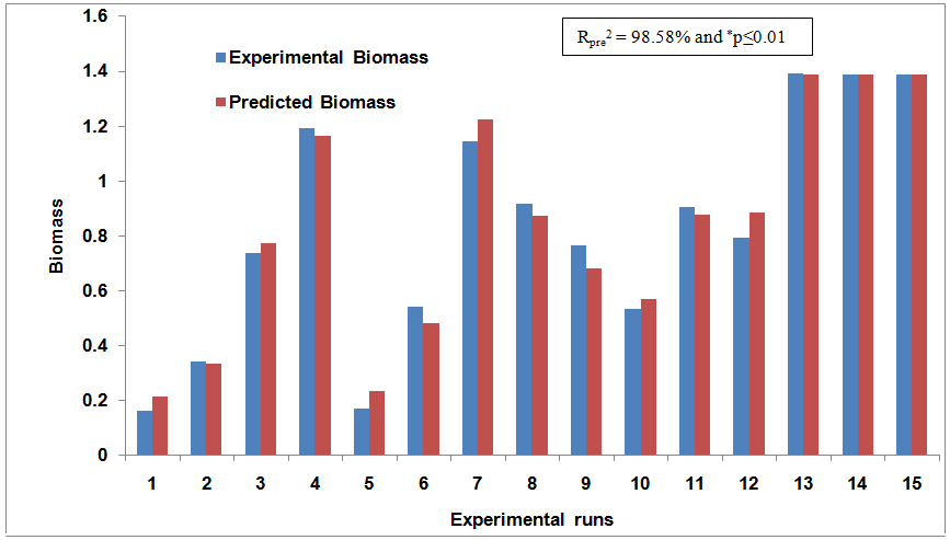 Summary of ANOVA for biomass was given in table 6 which indicated that biomass concentration was well described by proposed polynomial model given in Eq.10 (F-Value: 36.612).