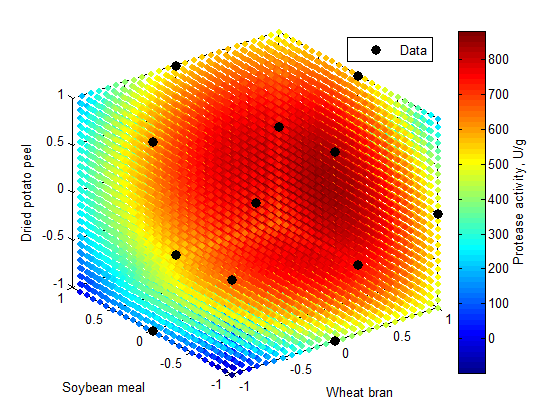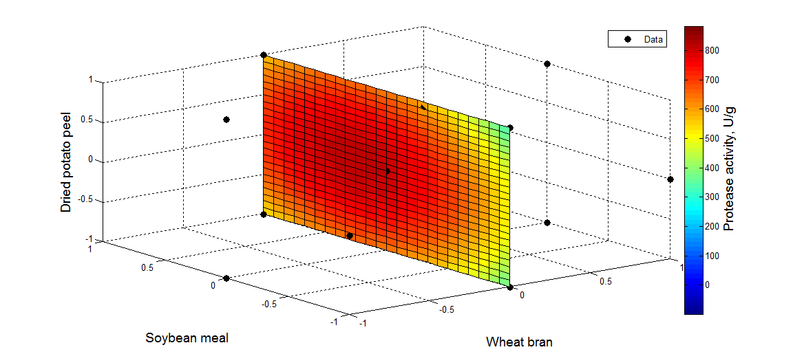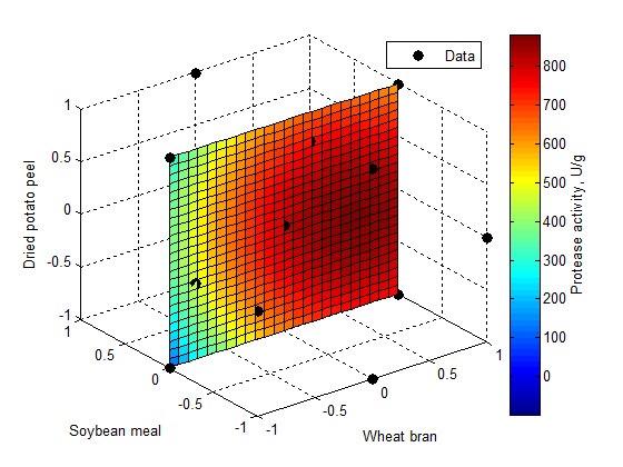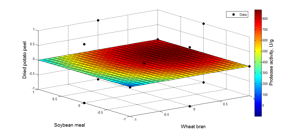 Minimum to maximum predicted enzyme activity was noticed as 150 and 975 U/g from contour diagrams. Optimum combination of substrates (Wheat bran: 8.841 g, Soybean meal: 4.557 g, and DPP: 0.661 g) was achieved through predicted plot of full quadratic model (*p≤0.01) with the acid protease activity of 817.83 U/g (±44.047 U/g). The coefficients of second order polynomial model for the prediction of enzyme activity (table 4) and for biomass were determined by using ANOVA (Analysis of ariance) and the proposed models were as follows: