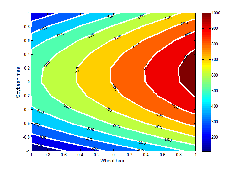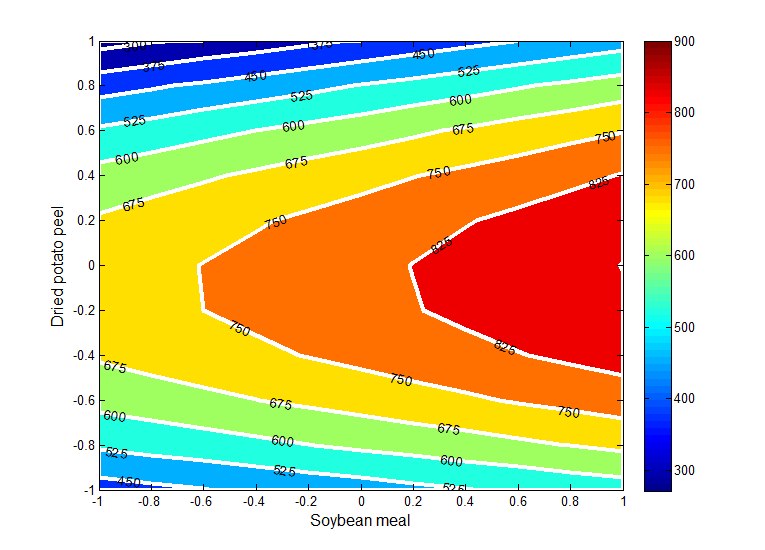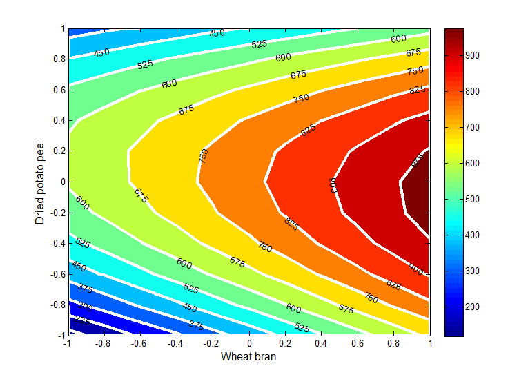 Y-Predicted response, X1–Wheat bran, X2–Soybean meal, X3–DPP, β0-Value of fitted response at the center point of the design, βi–Independent terms, βij-Interaction coefficients, βii-Quadratic coefficients
