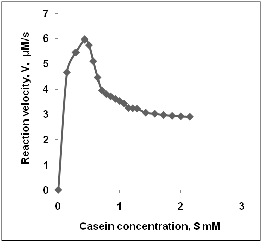 In the present work we obtained maximum yield of enzyme through RSM method. Further study was carried out to achieve better yield with casein as assay substrate. In order to find out of suitable concentration of substrate on protease activity, the effect of substrate concentration in a range of 0.1 to 2.2 mmol was studied. The velocity of caseinolysis by crude acid protease was shown by Michaelis-Menten plot (fig. 7a) and Line weaver-Burk plot (Fig.7b). It was noticed that velocity had deviated from normal rectangular hyperbola to decreased pattern at excess casein and it was due to partial SI. Experimental velocity of casein hydrolysis reached to a maximum velocity of 5.956 μM/s when casein concentration range is 0 to 0.4 mmol and then reduced to 2.89 μM/s beyond 0.4 mmol. It was also noticed that a linear increase in velocity up to 0.4 mmol of casein concentration and an immediate decrease in velocity was observed till 1.1 mmol of concentration. Later the velocity reached to a steady value even the increase in substrate concentration (fig. 7a). Similar behavior for phosphofructokinase was observed [18] and the authors were described this trend was due to partial SI. In addition, the biological significance of SI was well illustrated for various biocatalysts [16].