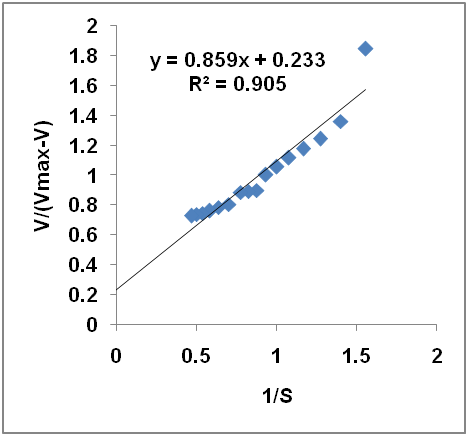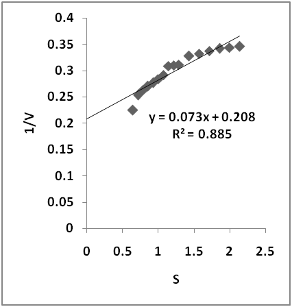 Fig. 7a: Plot showing the dependency of velocity on S-Deviation from rectangular behavior represented by Michaelis–Menten plot