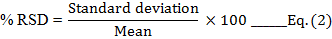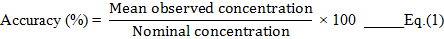The lower limit of quantification (LLOQ) for drugs was defined as the lowest concentration giving a signal-to-noise ratio of at least 10-fold, acceptable accuracy (80–120%), and precision (within 20%); this was verified by the analysis of 10 replicates. Intra-and inter-day accuracy and precision of this method were determined at three different concentration levels on three different days, and on each day, three replicates were analyzed. The accuracy and precision were expressed as percentage accuracy and relative standard deviation (R. SD, %) respectively, and calculated using following equation (1) and (2).