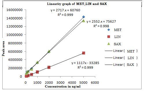 The validation parameters like specificity, linearity, sensitivity, and accuracy, precision were done according to the ICH guidelines [24] and also referred few publications on method development and validation [25, 26]. Selectivity is studied by comparing the chromatograms obtained from placebo sample with the chromatogram obtained from tablets. Calibration standards are prepared by spiking required volume of working standard of MET, LIN and SAX solution in different 10 ml volumetric flasks and volume made up with methanol to yield concentration range of 50-5000 ng/ml of drugs. The resultant peak areas of drugs were measured. The linearity of the method was determined by plotting the peak area (y) of drugs (MET, LIN and SAX) against normal concentration (x) of drugs, respectively.
