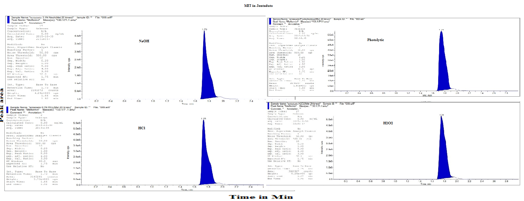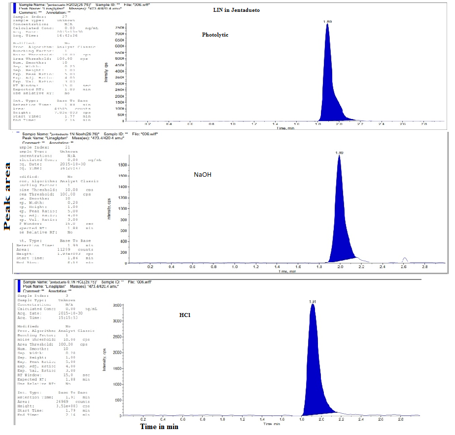 The stress studies were conducted for LIN and MET combination by HPLC method. In acid and alkali hydrolysis of both MET and LIN were degraded by increasing the strength of acid and alkali and similarly degradation was also observed with peroxide. Further studies in photolytic degradation, MET was quantifiable significantly whereas LIN was found to be quantifiable but very low. LIN was completely degraded in the photolytic condition and detectability in either the drug or its degradants was not possible and hence no quantification of linagliptin by LCMS was observed. SAX was completely degraded in the alkaline and peroxide solutions but partially degraded in acidic and photolytic conditions. The saxagliptin (SAX) or its degradants were not detectable. Hence no quantification of saxagliptin was attempted.