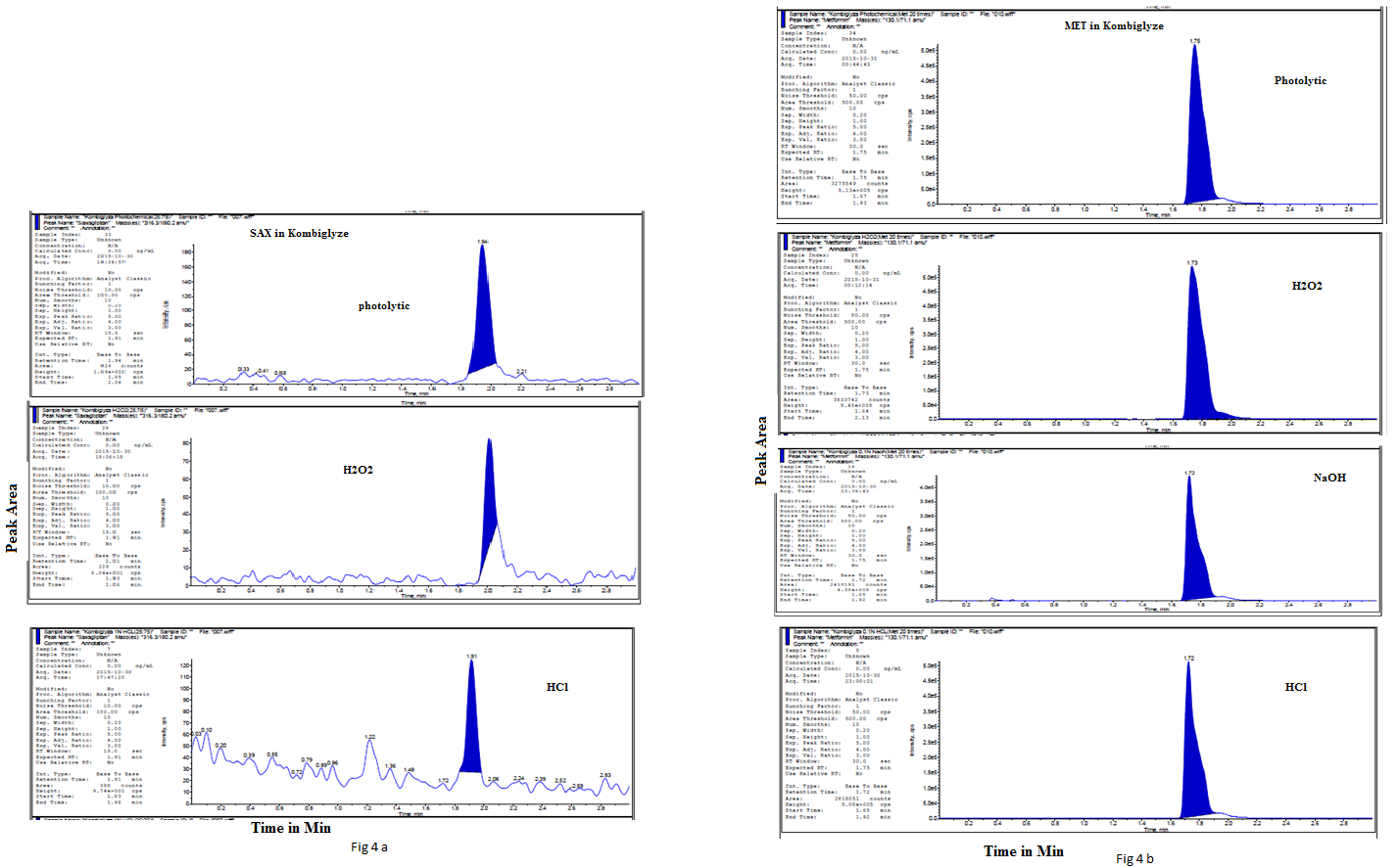 Fig. 4: Chromatograms of MET (4a) and SAX (4b) in kombiglyze sample under stress conditions
