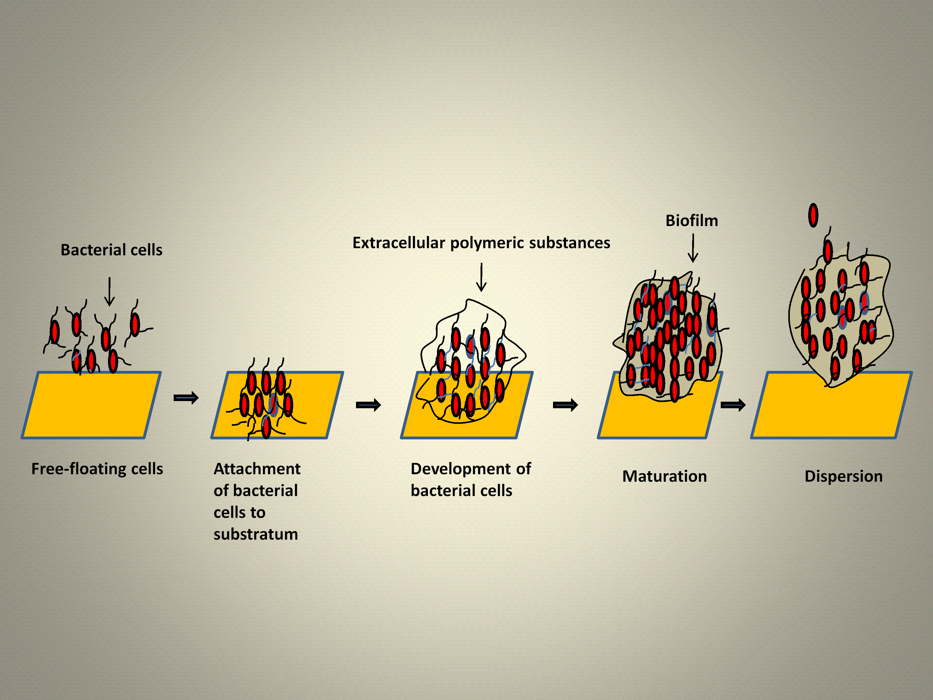 Fig. 1: Showing different stages of biofilm formation (self-drawn in MS Powerpoint)