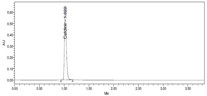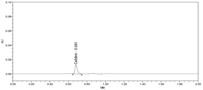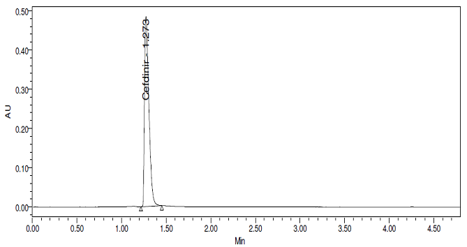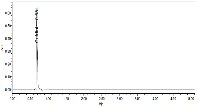 Conclusion: The developed method was validated with respect to linearity, accuracy, precision limit of detection and quantification, robustness and specificity. The method was applied successfully for the determination of cefdinir in tablets.