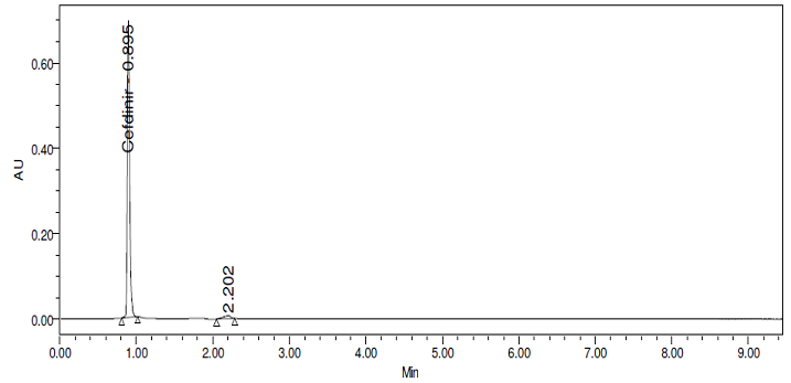 Forced degradation studies of cefdinir was carried out under conditions of acid hydrolysis (5N hydrochloric acid was added and refluxed for 30 min at 60 °), base hydrolysis (5N sodium hydroxide was added and refluxed for 30 min at 60 °), peroxide treatment (20% hydrogen peroxide was kept for 30 min at 60 °), thermal degradation (solid API was heated at 105 ° for 6 h in an oven) and photolytic degradation (sample was exposed to UV for one day). The treated samples were diluted with diluent to the desired concentration of 100µg/ml and injected in the established method. All the stressed samples are quantified for cefdinir [16].