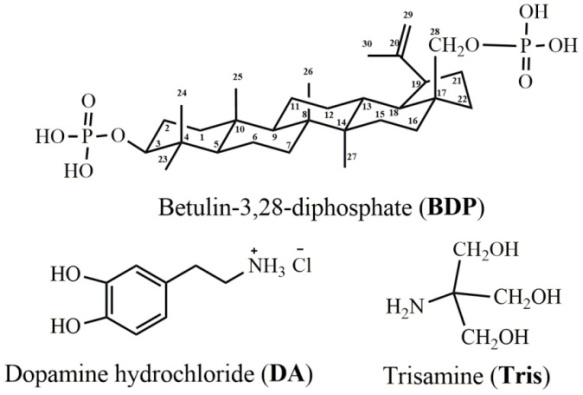 Fig. 1: Betulin-3, 28-diphosphate, dopamine hydrochloride and trisamine structures