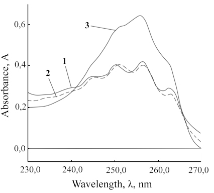 Fig. 3: UV-spectra of 1·10-3M BDP solutions: 1–in 95% alcohol; 2–in 4∙10-3M NaOH aqueous solution; 3–in 0.02M H2SO4 alcohol solution