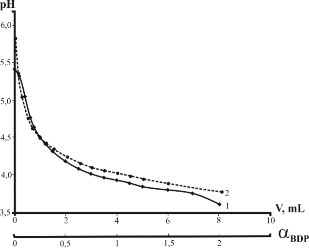 The potentiometric titration curve of 8∙10-5M DA solution in water by 1∙10-3M BDP alcohol solution shows pH changes of DA solution from pH 5.4 (without BDP) to 3.6 after BDP addition (fig. 4, curve 1). The data were compared with the blank experiment in water solutions containing the same BDP concentration (fig. 4, curve 2).