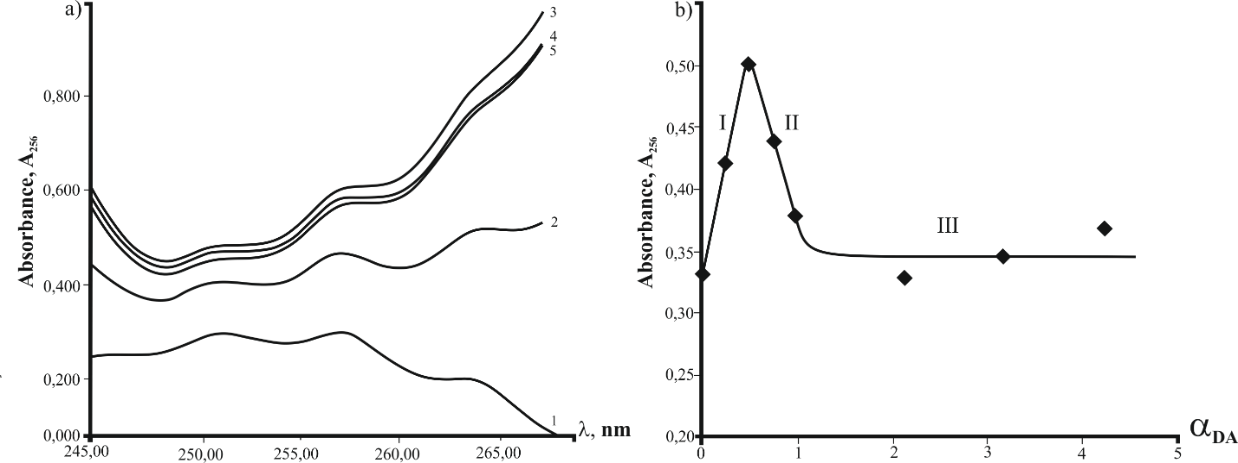 It has been shown that absorption A256 depended on DA molar ratio (fig. 6). At the first stage, A256 has increased by half like in 0.02M H2SO4 alcohol solution (section I) that characterizes the interaction of BDP-anion (base B) with protonated NH3+-group of DA and the salt complexes formation.