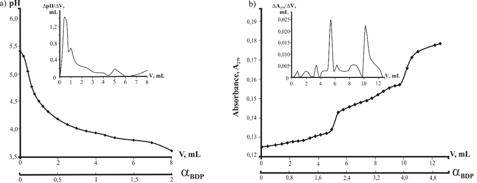 Fig. 4: The dependence of pH on molar ratio αBDP = nBDP/nDA pH = f (αBDP) in the BDP-DA system, CDA(initial)= const = 5.0∙10-5M, CBDPTitrant = 2.0∙10-3M