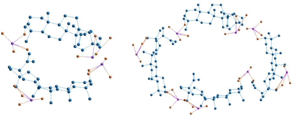 Fig. 8: Geometric visualization of BDP as a component of inclusion complexes formed by two and four molecules. Quantum-chemical calculations were provided by HyperChem 8.0 (semiempirical method AM1) [18]