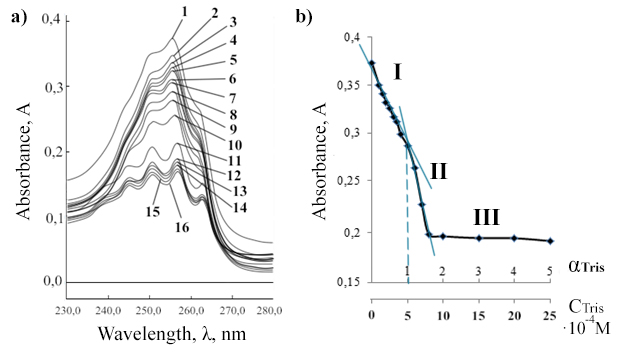 Fig. 9: UV-spectra of BDP and Tris mixtures at constant concentration CBDP=4.9·10-4M, CLiClO4=1·10-2M: a) А = f(λ); b) dependence of absorption A on molar ratio А = f(α) or on Tris concentration А=f(СTris)