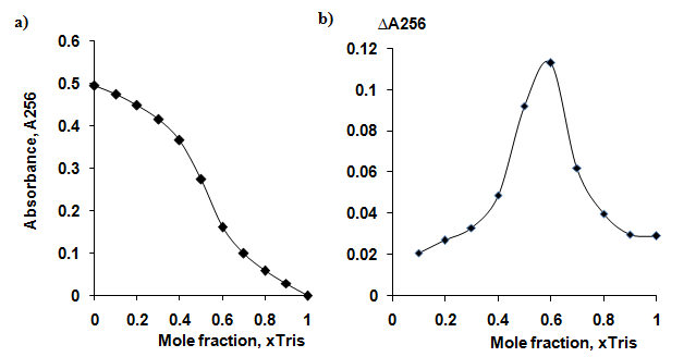 Fig. 10: Spectrophotometric titration in accordance to the Job’s method. Concentration of initial solutions of BDP and Tris equal to 9.8·10-4M, LiClO4 concentration is 1·10-2M, water-alcohol medium: a)А = f(xTris); b) ∆А = f(xTris)