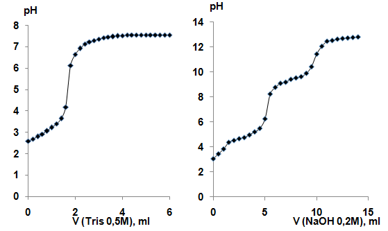 Fig. 11: Results of potentiometric titration of 10 ml 0.05M betulin-3,28-diphosphate alcohol solution by base aqueous solutions: a) 0.5M trisamine; b) 0.2M NaOH