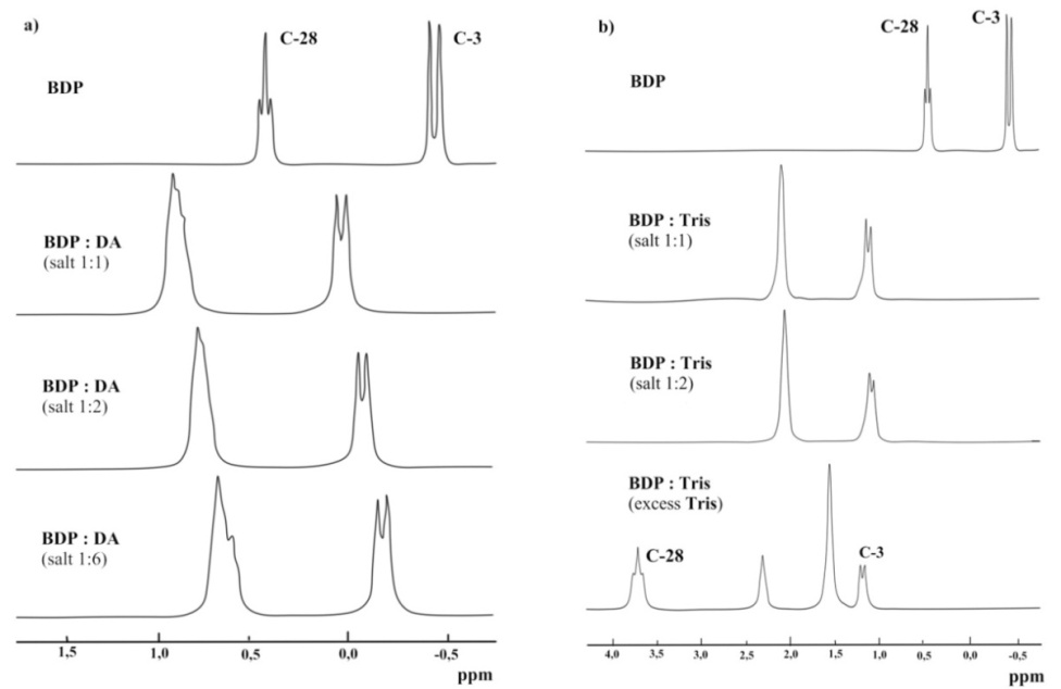 It will be expected that formation of the BDP salt complexes with amines improves its bioavailability. On the other hand, BDP may be a drug delivery agent of readily oxidizable amines such as catecholamines binding them in complexes by that to prevent amines oxidation. However, data on the betulin phosphate salt complexes with organic amines are lacking.