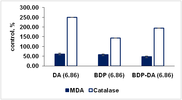 The effectiveness of the BDP-DA complexes is dose-dependent in phosphate buffer pH 6.86 under conditions close to physiological. The MDA level was decreased by half at a dose of 5 μg/ml under BDP action whereas the BDP-DA complex decreased the MDA level at a dose of 2 μg/ml (fig. 15, 16, table 6).