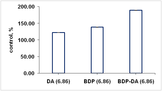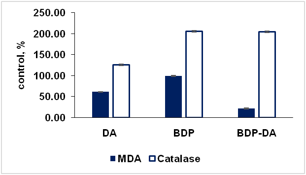 Along with this, the catalase activity increased under the same conditions for the BDP-DA complex at doses of 2 and 5 μg/ml (194 and 189%, respectively), which is higher than the catalase activity for BDP at the same doses (143 and 138%, respectively).