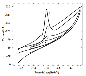 Fig. 2: Typical cyclic voltammograms of DLTD in PB solution, concentration: 2.55x10-5M at glassy carbon electrode in different pH values from pH 4.0-10.0 (a to d)