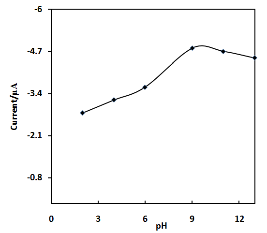 Fig. 3: The plot the of current vs pH of DLTD in PB solution, concentration: 2.55x10-5M at glassy carbon electrode in different pH values