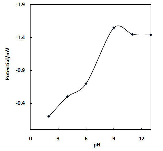 Fig. 4: The plot of the potential vs pH of DLTD in PB solution, concentration: 2.55x10-5M at glassy carbon electrode in different pH values.