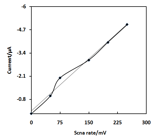 The influence of the scan rate was investigated. The results suggested that square wave voltammetric peak current reached maximum value when the scan rate was 50 mV. As for the scan rate; the current response with increasing the scan rate of 50mVs-1 to 100 mVs-1gave the maximum response (Fig 5). Accordingly, the optimum conditions for recording a maximum developed and sharper peak for DLTD are tacc: 60 sec., Eacc: -1.55V, scan rate: 50 mVs-1 and pulse amplitude: 50 mV, optimum temperature: 25oC.