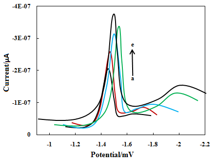 Fig. 6: Typical square wave voltammograms of DLTD in PB solution pH 9.0, concentration: 1.0x10-3M to 2.55x10-5M (a to e) at glassy carbon electrode
