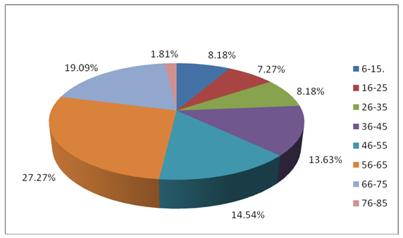In the present study, the age of the patients ranged from 6-85 y. Maximum number of patients 27.27% (30) was in the age group of 56-65 y followed by the age group 66-75 y (19%). Our study indicates that LRTIs are more prevalent in older patients. Few studies have reported that majority of patient's fall in different age groups like 45-60 y and greater than 60 y with URTI [16]. Our results showed that LRTIs are predominant in older patients (age range 56-75 y).