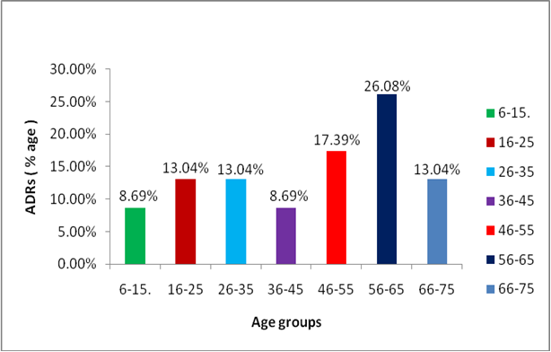 The prevalence of ADRs was found to be highest in patients between 56-65 y (26.08%) followed by 46-55 y (17.39%) fig. 5.