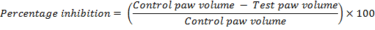 For screening and assessment of anti-inflammatory compounds, carrageenan-induced paw edema is widely used animal model for acute inflammation and was introduced by [11]. Carrageenan is a mucopolysaccharide, derived from Iris sea moss, produce non-immunological edema. There are two phases of carrageenan-induced inflammatory reactions, i.e. Initial phase and late phase. The initial phase (1-3h) involves the release of histamine, serotonin and kinins from mast cells responsible for swelling and pain [12]. During the late phase (4-5 h) two important inflammatory mediators such as prostaglandin E2 (PGE2) and leukotriene B4 are synthesized from arachidonic acid-dependent pathways by cyclooxygenase-2 (COX-2) and 5-lipoxygenase (5-LOX) enzymatic system involved with the commencement of inflammatory reactions.