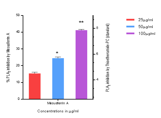Fig. 1: Inhibitory effect of Mesuaferrin–A against PLA2 activity compared with, Thioether amide-PC standard. Values are mean of three replicates±SEM. *p≤0.05, **p≤0.01, ***p≤0.001 represents a significant difference compared with the Thioetheramide-PC (5 μg/ml)