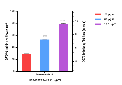 Fig. 2: Inhibitory Effect of Mesuaferrin–A against COX-2 activity compared with, Diclofenac sodium. Values are mean of three replicates±SEM. *p≤0.05, **p≤0.01, ***p≤0.001 represents a significant difference compared with the Diclofenac sodium