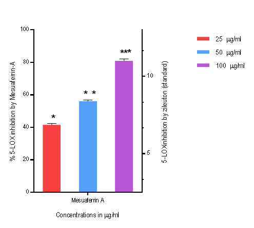 The Mesuaferrin-A was tested for 5-LOX inhibitory activity by taking different doses viz., 25, 50 and 100μg/ml as shown in fig. 3,a significant dose-dependent percentage inhibition of 5-LOX activity was observed at 100μg/ml was found to be 81.03% with IC50 value of 35.74µg/ml, (***p≤0.001), while that of standard inhibitor zileuton whose IC50 value was 5.09µg/ml.