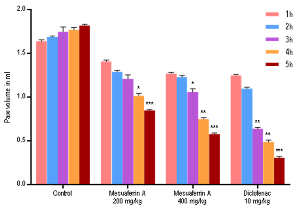 Fig. 4: Inhibitory effect of Mesuaferrin-A on carrageenan-induced paw volume (ml) in Wistar rats, values are mean of three replicates±SEM.*p≤0.05, **p≤0.01, ***p≤0.001 represents significant difference compared with the Diclofenac (10 mg/kg body weight)
