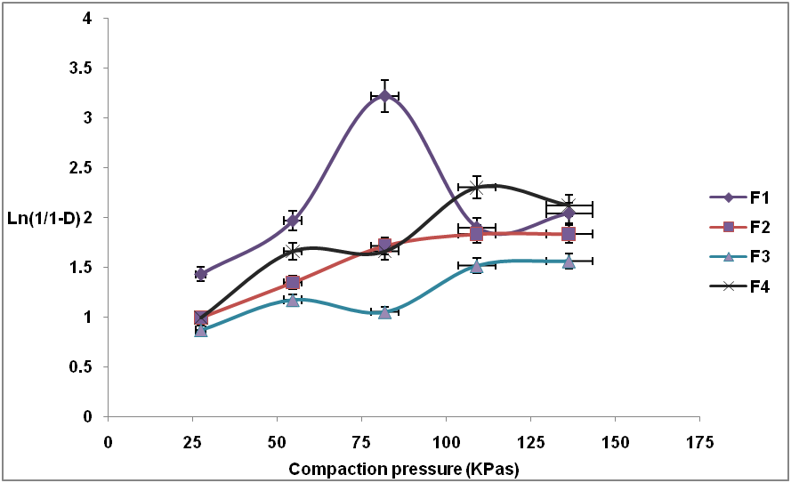 The Heckel plot (fig. 2) graphically represents how the powders behave in the presence of compressional force applied to form compact. It is developed on the assumption that powder compression follows a first order of reaction with the powder voids acting as ‘reactants’ and the compacts(having reduced porosity) being the products [15]. Values obtained at appropriate points on the plots classify the sample powders based on their behaviour under pressure. For example, larger K values (slope of the linear part of the plot) indicate harder compacts [5]. K also relates the minimum pressure necessary to cause a permanent deformation in the sample powder [17]. From table 4, F2 and F4 values are similar; while F1 is highest, F3 is lowest. This implies that F2 and F4 (composing of DSA and MCC respectively) would form compacts that are harder than those of F3. The F1, however, will form the hardest compacts of the four samples. This explains the tensile strength-compression force plot (fig. 4) which reflects such higher value in hardness as force of compression increased. This obvious trend is further corroborated (in fig. 3) where the binding efficiency has a steady rise with increasing compression pressure for F2. The binding efficiency of F1 on the other hand was consistently higher than others. One reason could be that higher compressional force favoured close-knit consolidation of the molecules of F2 and F1 possibly by fusion bonding.
