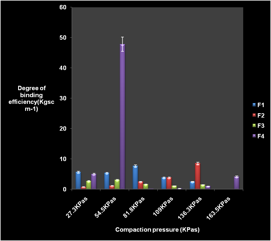 Fig. 3: Plot showing binding efficiency of compacts at different compaction pressures, three tablets were randomly selected and used for the determination for each batch at the respective pressure