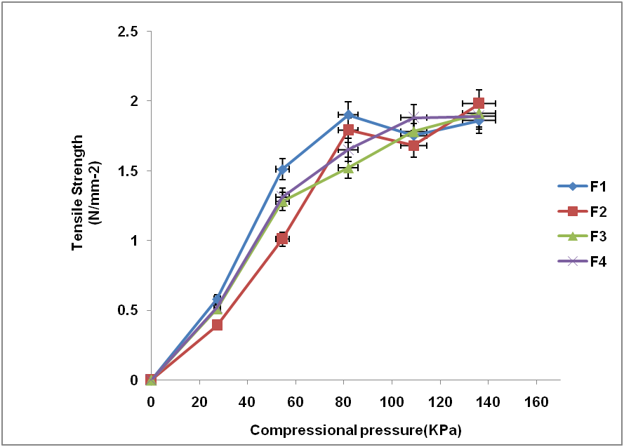 As shown in fig. 4, the increase in compression pressure, the greater the tensile strength for all the four compacts. F1 measured similarly as F2 and F4 at the same compression pressure. From compressional force of 0-100KPas, F1 showed the highest tensile strength but F2 was lowest. Above the 100KPas where the F1 became the lowest and tensile strength for F2 became highest at increased compression pressure. How compacted a tablet is has been linked to the amount of loading pressure which brings about close proximity of the particles being tableted so that they are held together by cold welding or fusion bonding [20]. Generally higher tensile strength reflects strong interparticulate bond formation, harder compacts and is proportional to the compression force [9]. Thus to form harder tablets of F2, compression pressure will be optimized at above 100KPas.