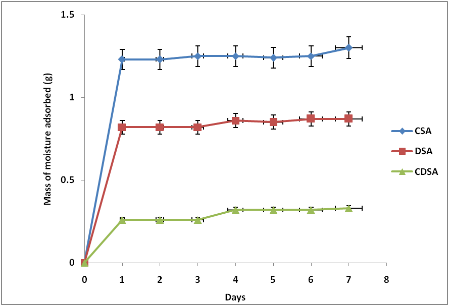However, it is noteworthy that although all powders had a same moisture content, moisture sorption profile reveals that the CSA possessed higher sensitivity to atmospheric moisture over the DSA and its admixture (fig. 5). Unlike the relative improvement of the admixed powders in other moisture-related indicators, (swelling index and hydration capacities), the ‘proximal interparticle association’ reduced the effective surface area of the CSA thereby reducing its effective attraction of water moisture. Higher moisture content in a pharmaceutical powder can influence its flow properties, containers for storage and affect negatively any incorporated drug that can hydrolyse in the presence of moisture.
